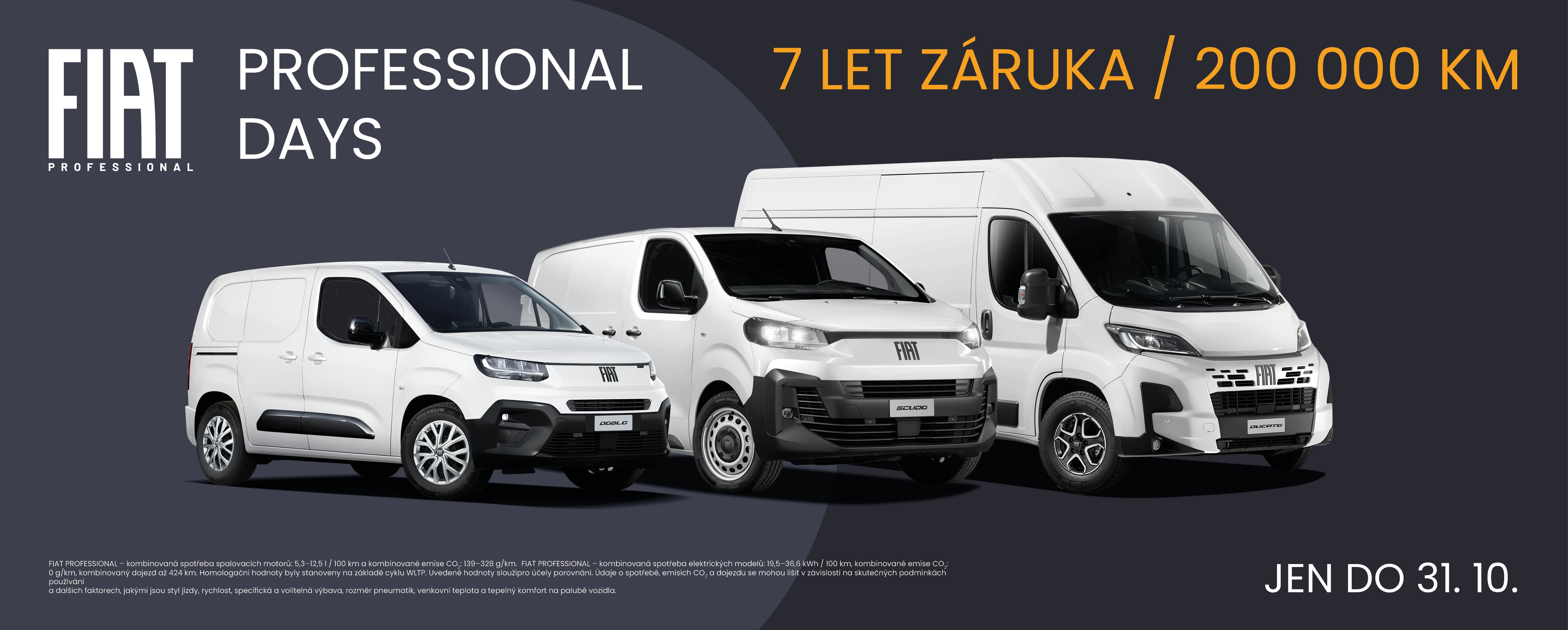Značka Fiat Professional přijíždí s nabídkou, která se již nemusí opakovat – atraktivní cena, atraktivní podmínky financování, a navíc pro všechny, kdo si pořídí užitkový vůz v rámci akce Fiat Professional Days, 7letá záruka (200 000 km) na zakoupený vůz. Prodejní akce Fiat Professional Days začíná dnes a potrvá až do 31. 10. 2025.